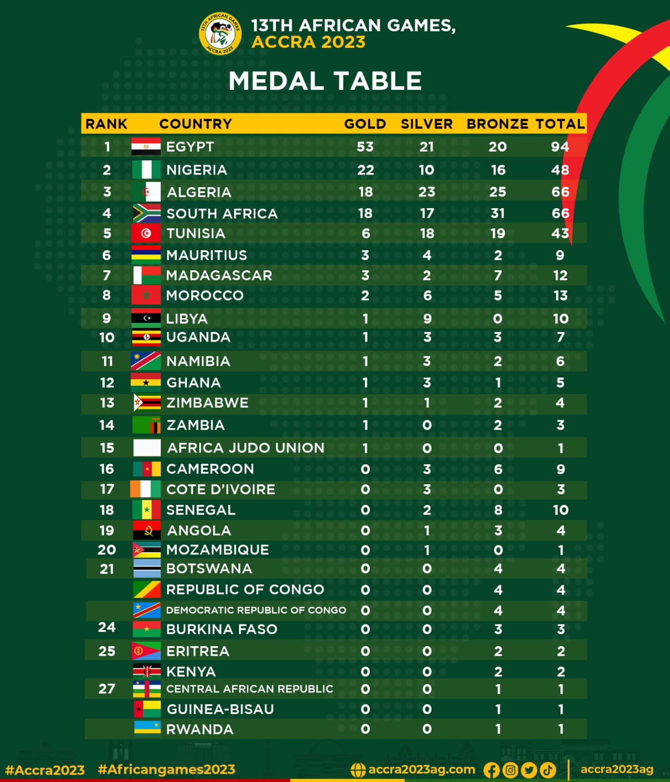According to the medal table released by the African Games, Egypt is topping the table with (53) Gold, (21) Silver and (20) Bronze while Nigeria is second with (22) Gold, (10) Silver and (16) Bronze. Algeria is in the third slot with (18) Gold, (23) Silver and (25) Bronze.
